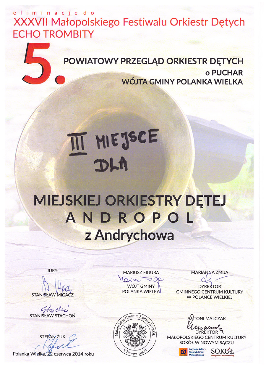 W dniu 22 czerwca 2014 r. odbył się V Powiatowy Przegląd Orkiestr Dętych o Puchar Wójta Gminy Polanka Wielka, który był jednocześnie eliminacją do XXXVII Małopolskiego Festiwalu Orkiestr Dętych "ECHO TROMBITY". Bardzo miło nam zakomunikować, że nasza orkiestra po rocznej przerwie związanej z remontami w siedzibie, zdobyła we wspomnianym przeglądzie wysokie III miejsce - potwierdzając tym samym swój wysoki poziom muzyczny.