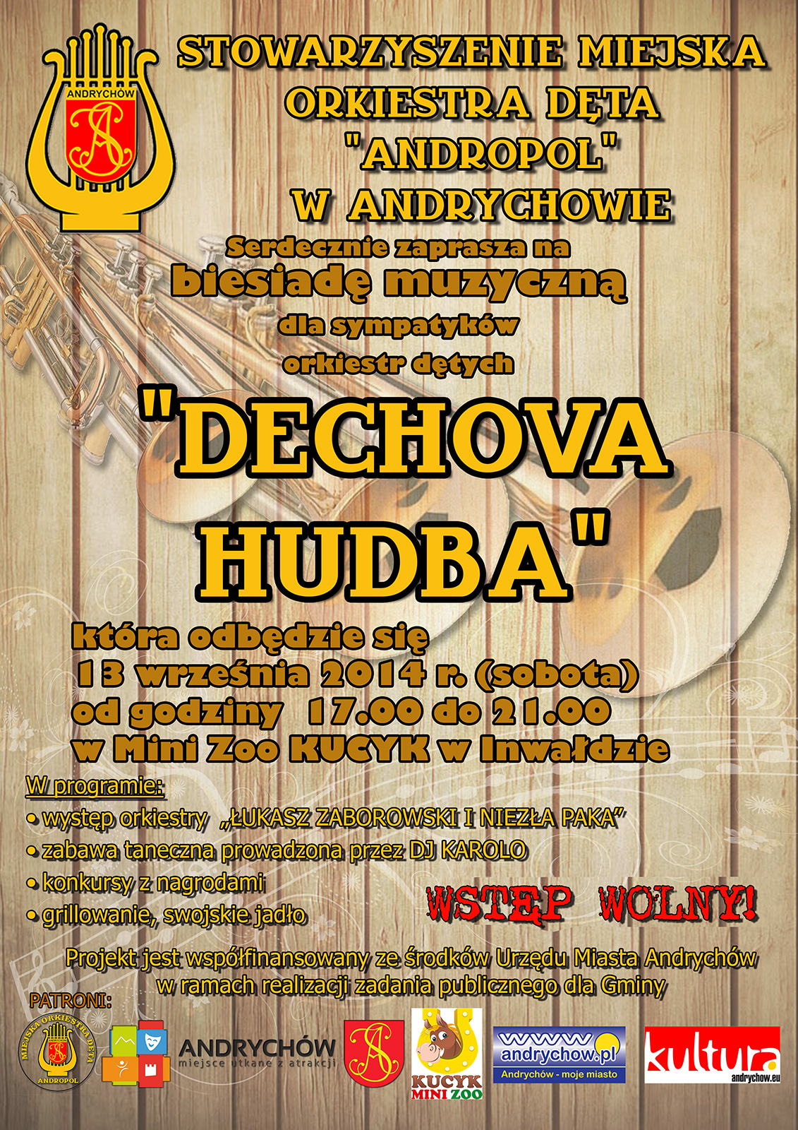 Już dziś serdecznie zapraszamy wszystkich sympatyków muzyki orkiestr dętych oraz wszystkich lubiących dobra zabawę, taniec i pyszne jedzenie. W dniu 13 września br. nasze stowarzyszenie organizuje biesiadę muzyczną zatytułowaną "DECHOVA HUDBA", która bedzie miała miejsce w MINI ZOO "Kucyk". Szczegóły na plakacie.