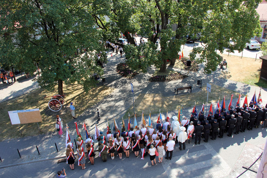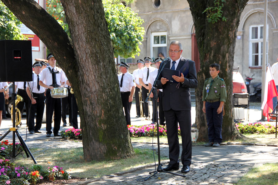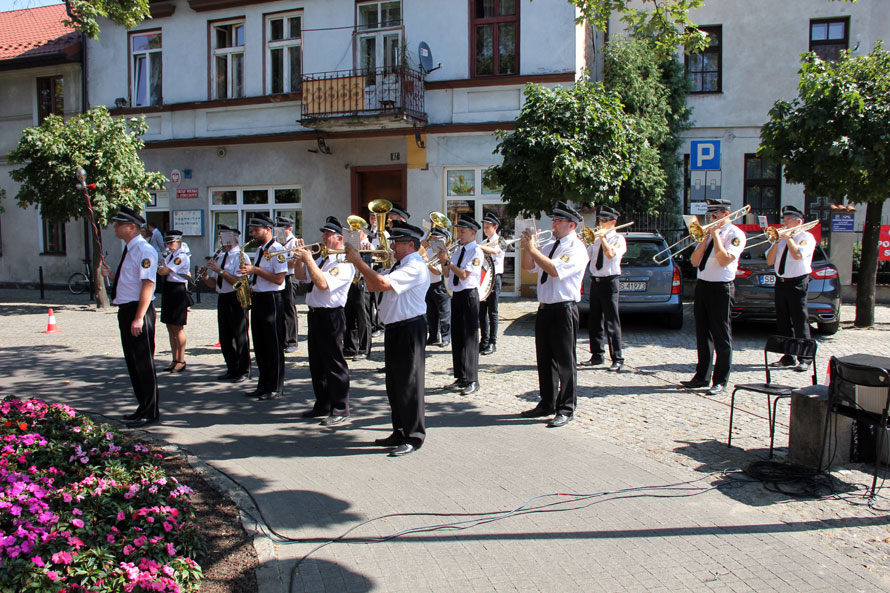 Orkiestra w swych pięknych strojach przywitała zbierające się poczty sztandarowe i delegacje kilkoma marszami. Następnie wykonała HYMN POLSKI, po którym przemówienie okolicznościowe wygłosił Pan Burmistrz Tomasz Żak.