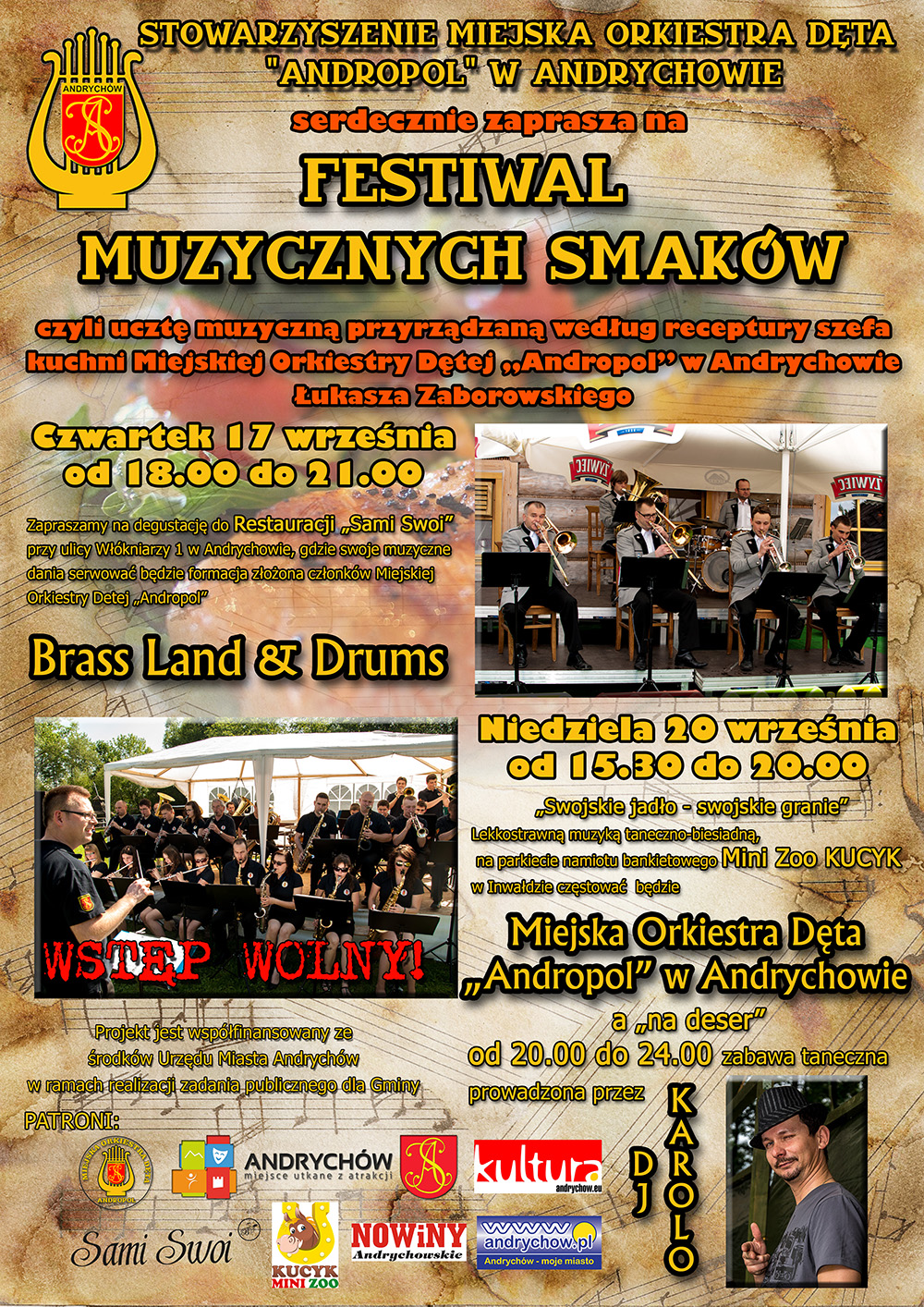 „FESTIWAL MUZYCZNCZNYCH SMAKÓW” to kolejne wydarzenie muzyczne organizowane przez Stowarzyszenie Miejska Orkiestra Dęta „Andropol” Andrychów dla mieszkańców gminy Andrychów. Tym razem andrychowska orkiestra pod kierunkiem Łukasz Zaborowskiego przygotowała bardzo różnorodny repertuar, który muzycy zaprezentują podczas dwóch koncertów w ramach festiwalu.