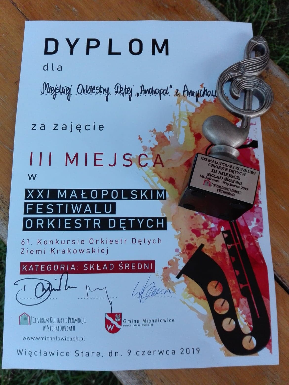 Niezmiernie miło nam poinformować, że nasza Orkiestra, zajęła wysokie III MIEJSCE w XXI Małopolskim Festiwalu Orkiestr Dętych Michałowice-Więcławice 2019 w kategorii średnia orkiestra dęta. Festiwal odbył się w dniu 9 czerwca 2019r.