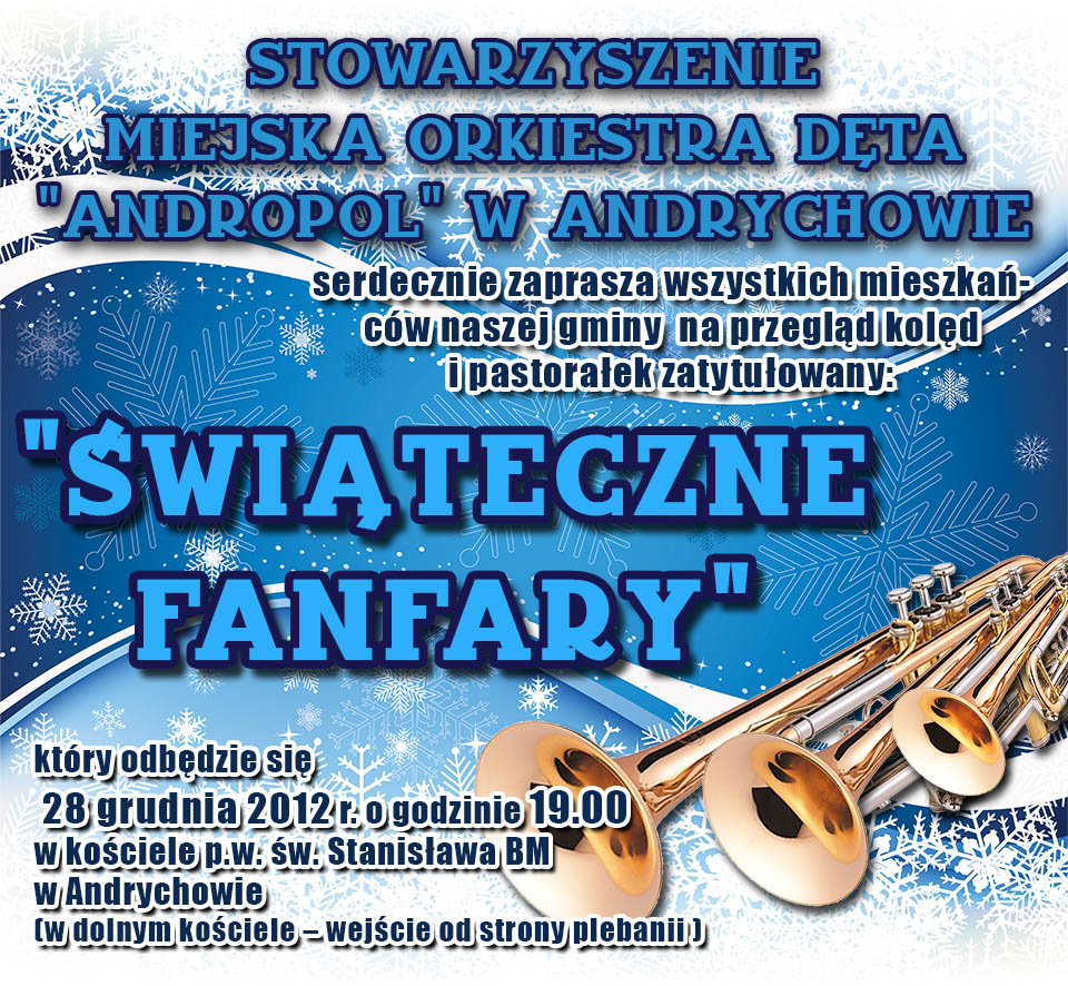 Andrychowska orkiestra dęta działająca od kilku lat jako Stowarzyszenie Miejska Orkiestra Dęta „ANDROPOL” Andrychów obchodzi w roku 2012 jubileusz 90-lecia działalności muzycznej. Aby uczcić to wydarzenie, pragniemy zaprosić wszystkich mieszkańców naszyj gminy do udziału w przeglądzie kolęd i pastorałek, zatytułowanym „ŚWIĄTECZNE FANFARY”.