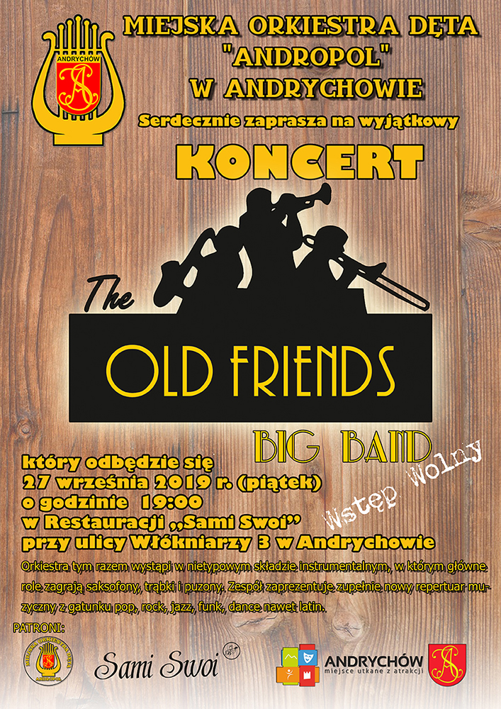 W piątek 27 września 2019 r. w niezwykle gościnnej i otwartej restauracji "Sami Swoi" w Andrychowie szeroko zebranej publiczności zaprezentowała się formacja "The Old Friends" Big Band. Projekt ten powstał w ramach naszego stowarzyszenia a głównym jego inicjatorem jest kapelmistrz naszej orkiestry Łukasz Zaborowski.